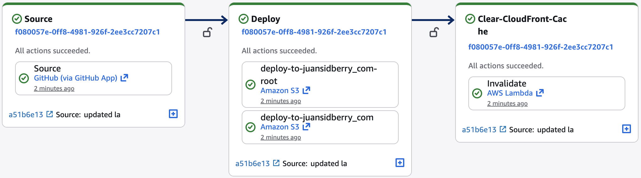 Route 53 is deployed and configured with the Domain Name of JuanSidberry.com and points it to the distribution endpoint of CloudFront.